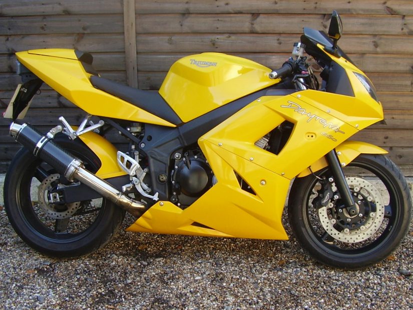 Highly original Triumph Daytona 650 in Speed Yellow. 2005 05 registered and the last generation of the 4-cylinder Daytonas. Previously sold by us. 14000 miles covered, with service history including it’s original stamped service book and old MOTs. These are a characterful 650cc sports bike, capable of a 160mph and a mid 11s 1/4 mile, so decently quick too. This particular example has been very well cared for and has some nice options fitted including a carbon SP Engineering exhaust can, colour coded rear hugger, integrated mirrors/indicators, integrated rear tail light, short adjustable levers, tinted screen, tank pad, and race cowl (with pillion seat) Most of the original parts are also present and supplied. Good matching Pirelli Diablo Rossos fitted. All in all, this is a great little bike, quick and agile, one that will provide fun and smiles a plenty, and not many to be found with such low mileage. VOSA mileage history report. Clear HPI report. All books/keys/documents present